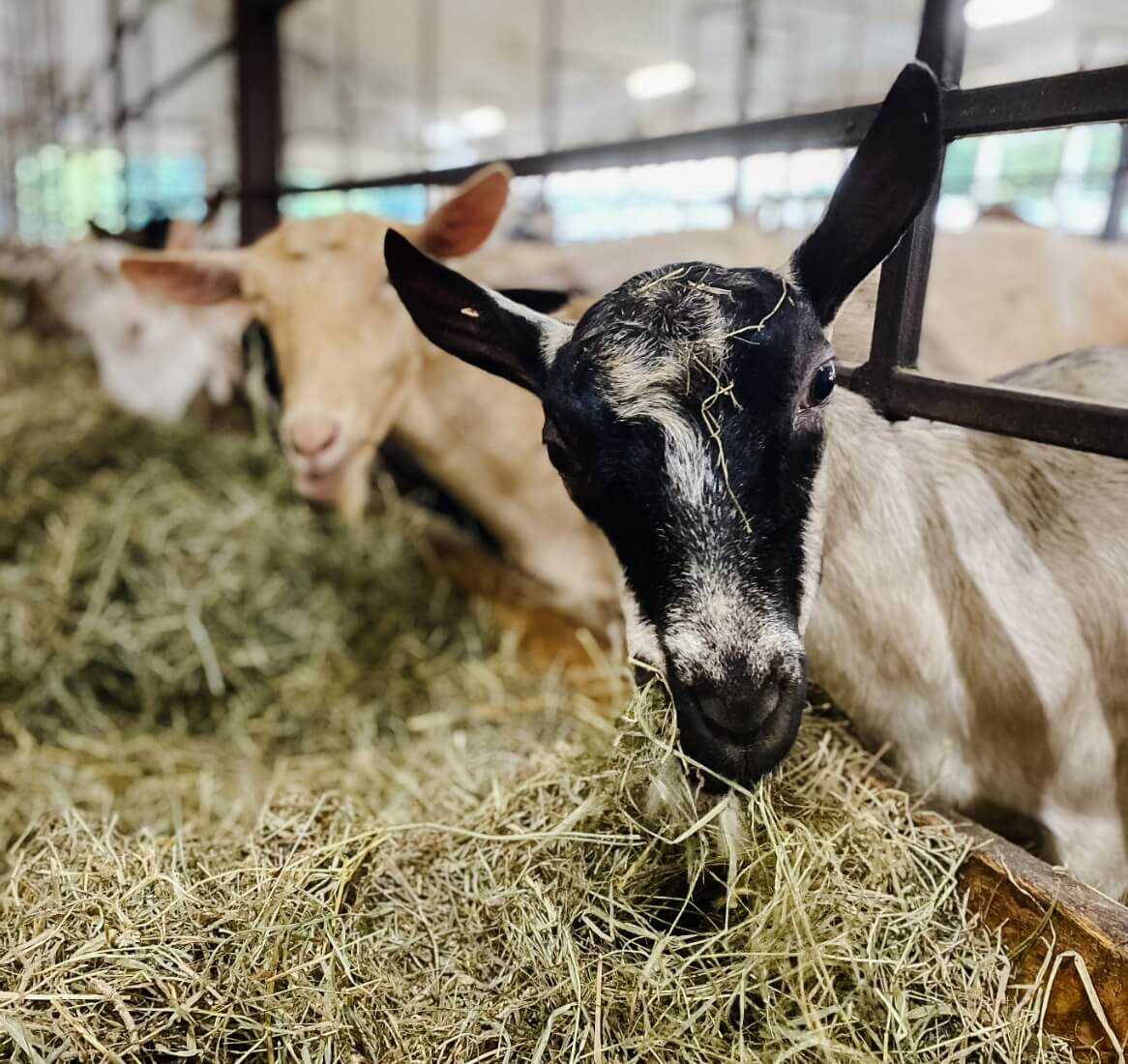 • Mélange fait à la ferme de paille et de moulée Caprilait servi à volonté aux chèvres laitières